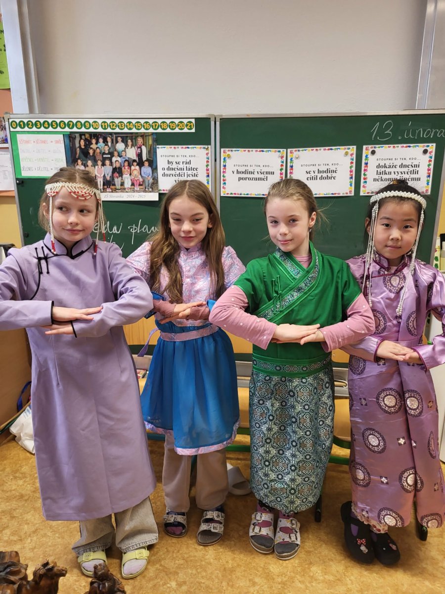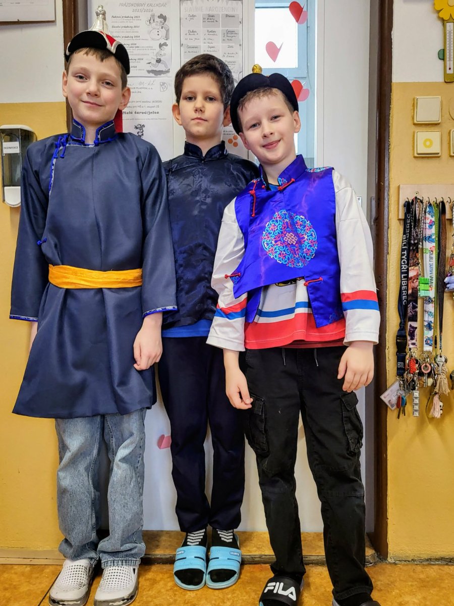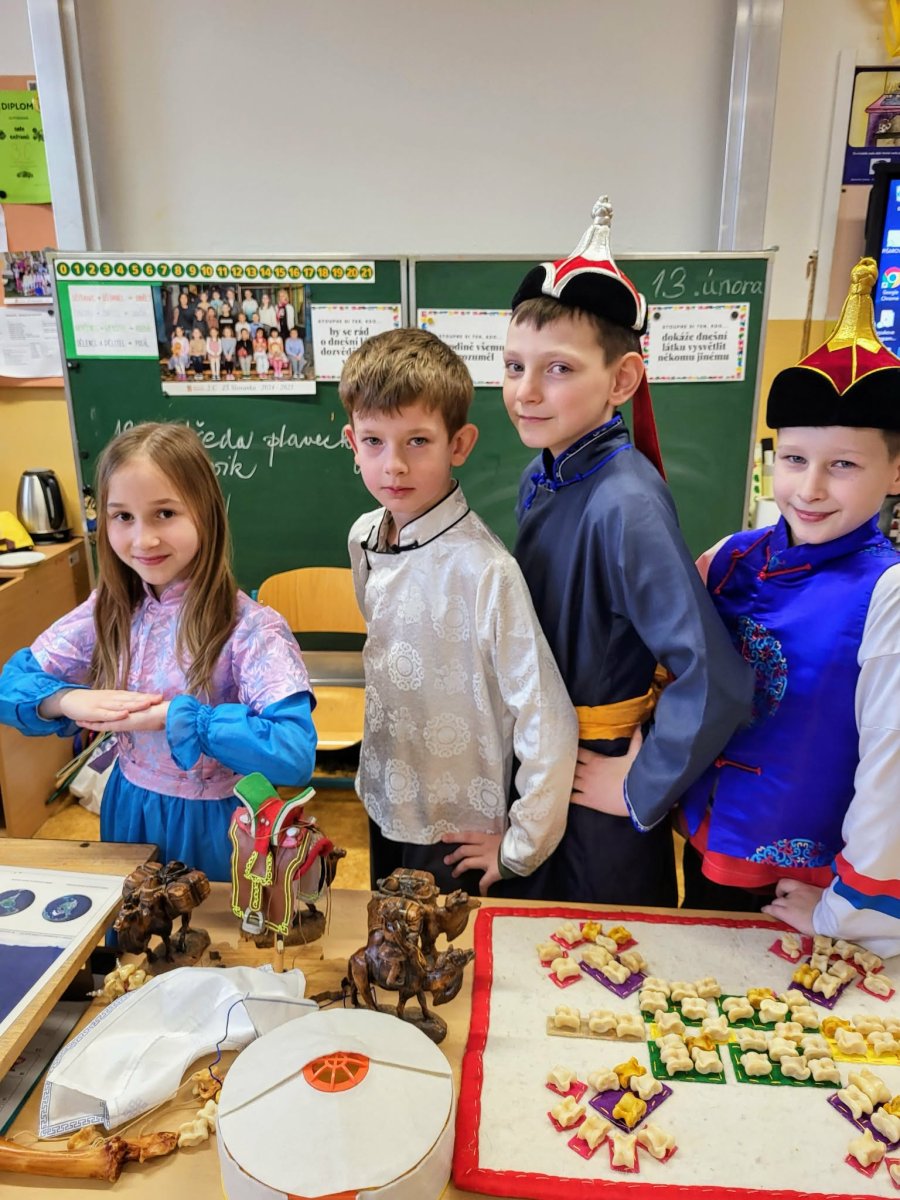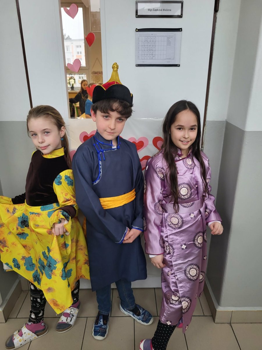 Naši mongolští spolužáci slaví jeden z hlavních svátků "Cagán sar"(Bílý měsíc) mongolský lunární Nový rok. Ve třídě 3.C jsme si dnes vyzkoušeli, díky paní asistentce Sáře, tradiční mongolské kroje, ochutnali jídlo a zahráli hry. Dozvěděli jsme se spoustu informací o tamním životě a kultuře. Byla to vskutku netradiční, velmi zajímavá a poučná hodina.