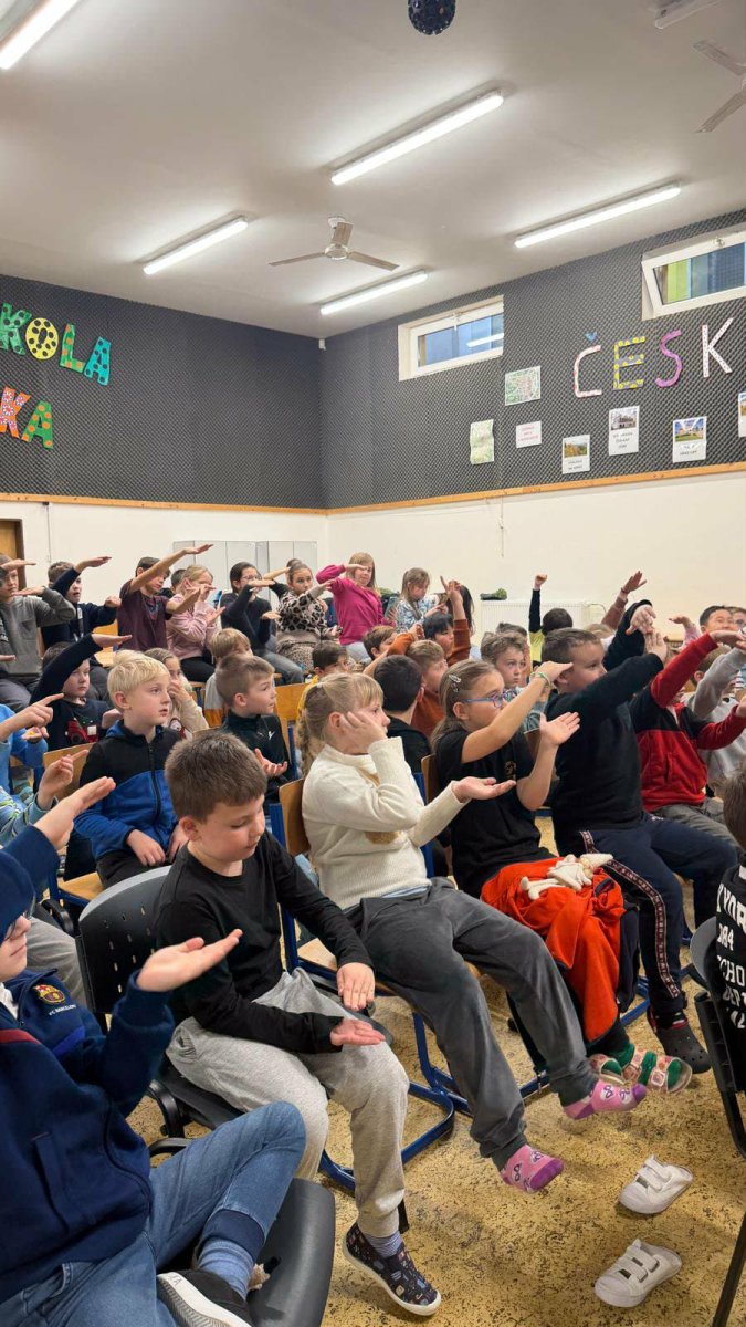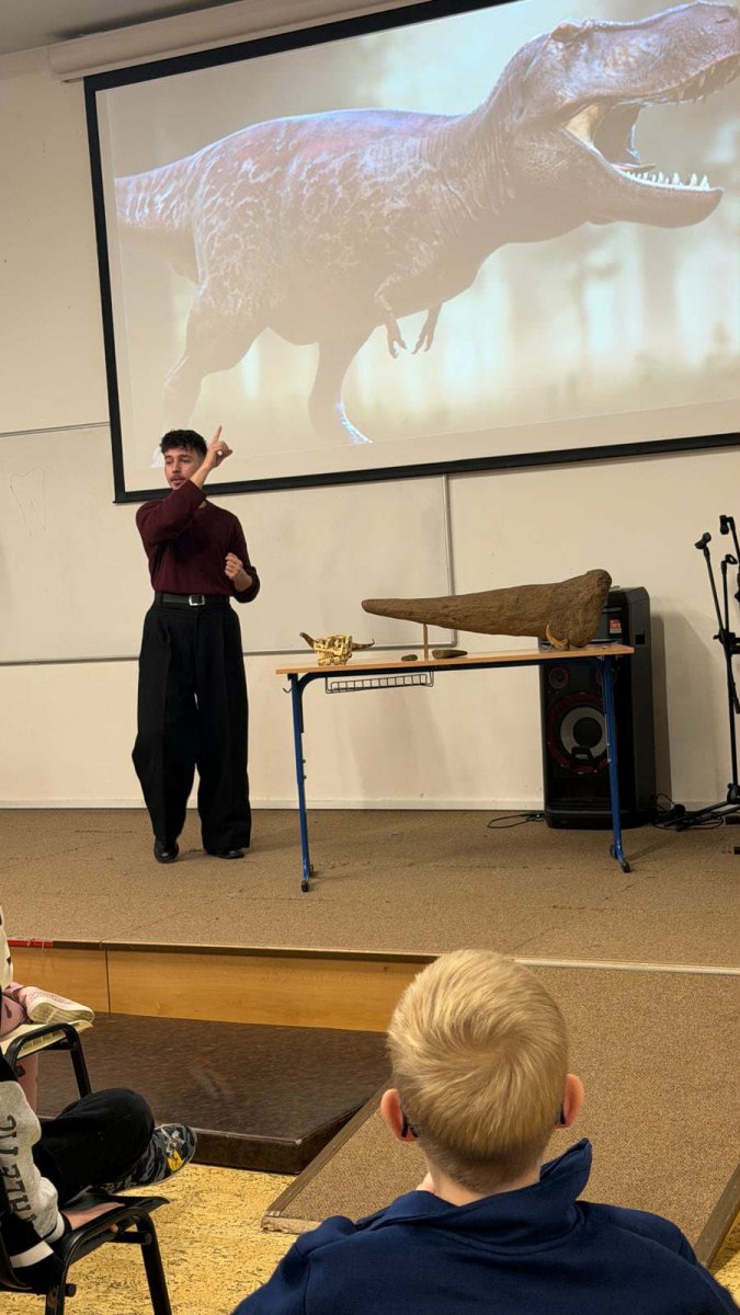 Dnešní návštěva, paleontologa Jakuba Matičky, proměnila naši třídu v okno do pravěku. Jeho poutavá přednáška o dinosaurech nás vtáhla do dob dávno minulých a nechala nahlédnout do fascinujícího světa, kde kdysi vládli obři dávných věků.