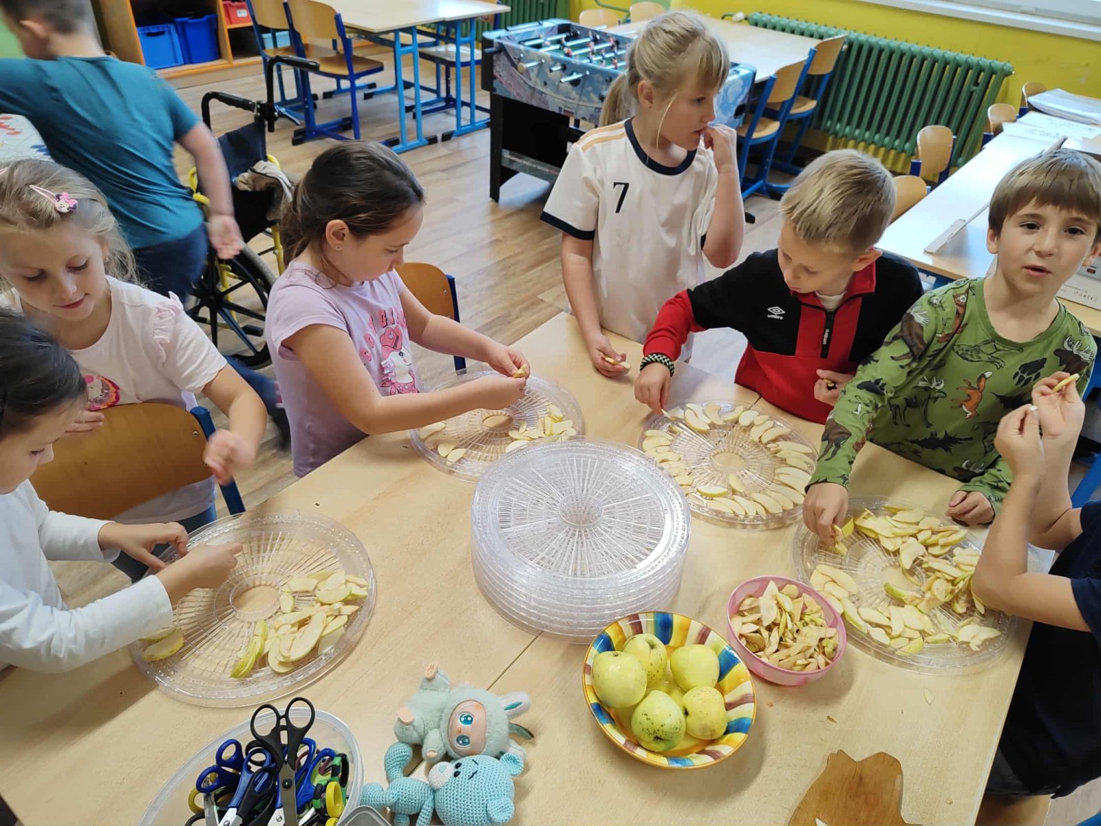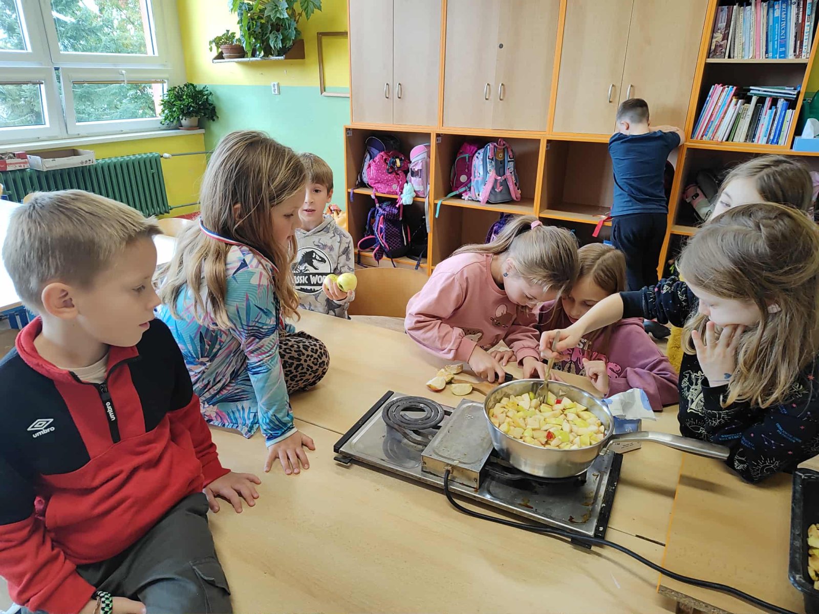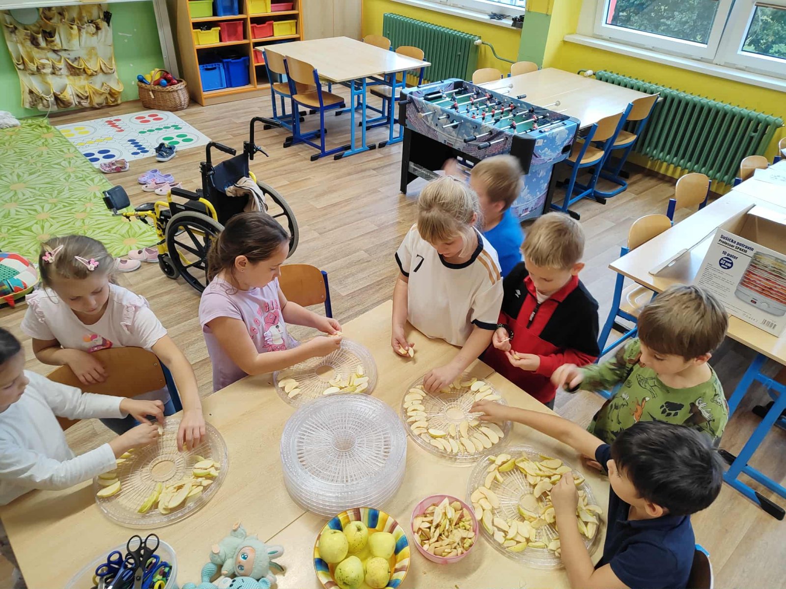 Zprávičky z oddělení ŠD Bublinky. Celý týden se nesl v duchu tématu „CHUTĚ A BARVY PODZIMU“. Vyzkoušeli jsme si tisk z výšky pomocí jablka, nakrájeli a usušili jablíčka na křížaly a také uvařili voňavý jablečný kompot. Teď už se všichni moc těšíme na JABLEČNÉ ODPOLEDNE S RODIČI! Vaše Mirka Bublinka