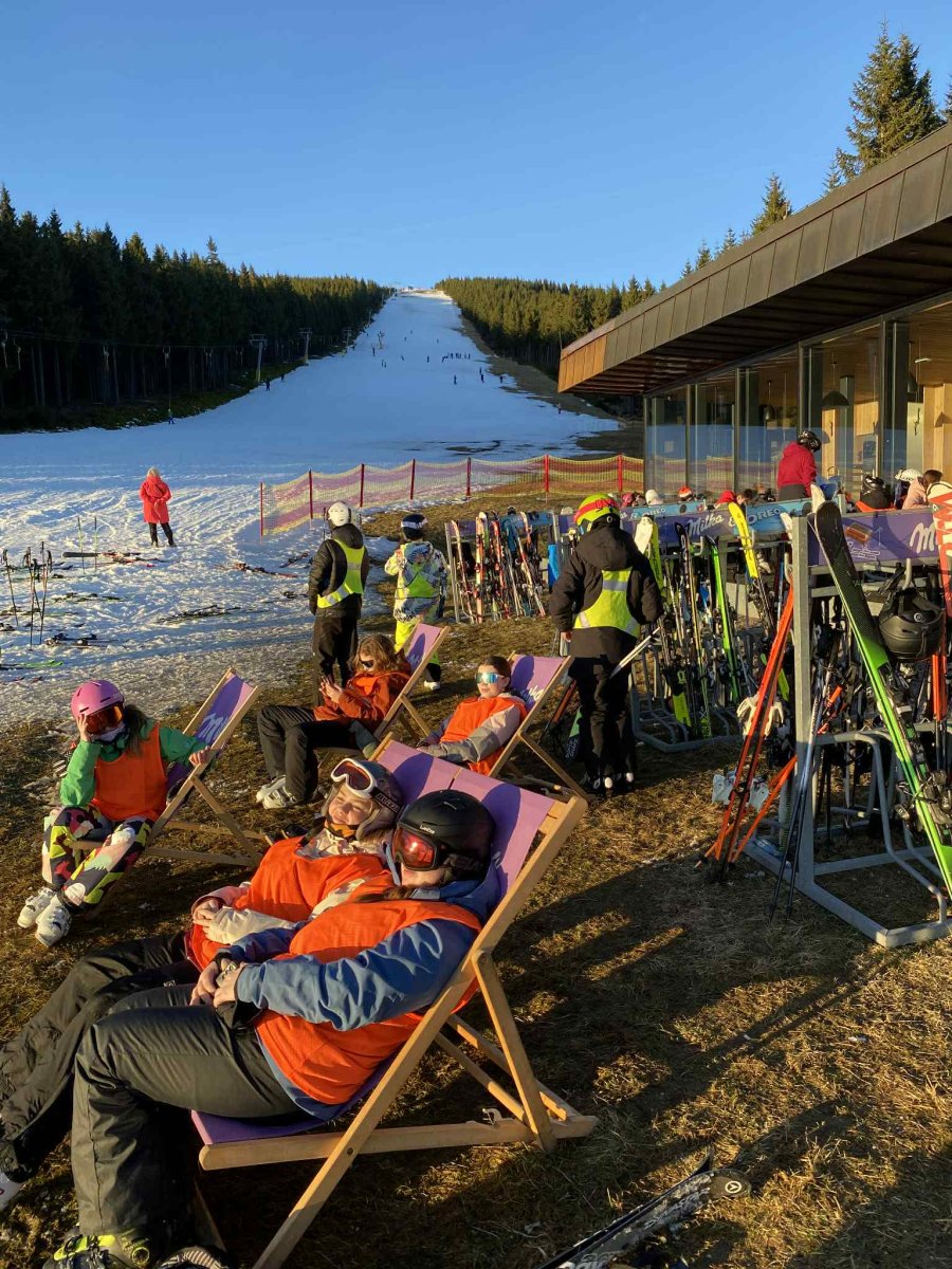 Horká čokoláda, pohodička na lehátku a nasávání posledních doušků lyžařské atmosféry.