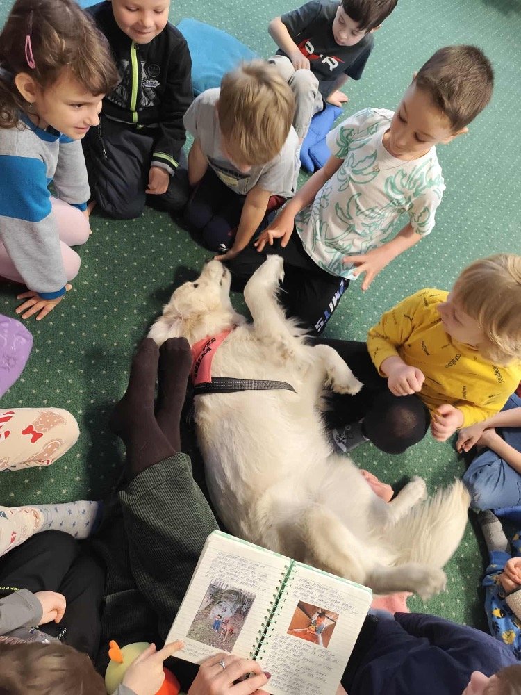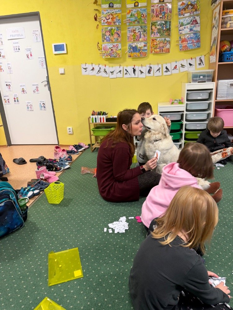 Je to fenka s průkazem původu, je plně očkovaná a pod pravidelným veterinárním dohledem. Naším cílem je postupně ji připravit na canisterapeutický výcvik, aby mohla děti podporovat ještě cíleněji – například při posilování sebedůvěry, soustředění nebo při adaptaci na školní prostředí.