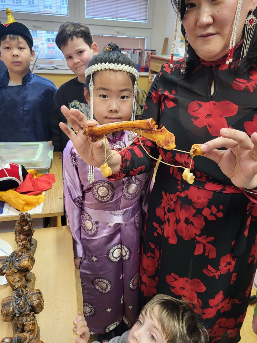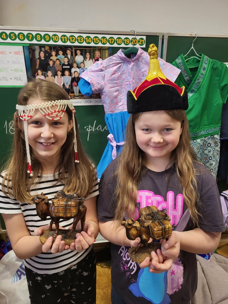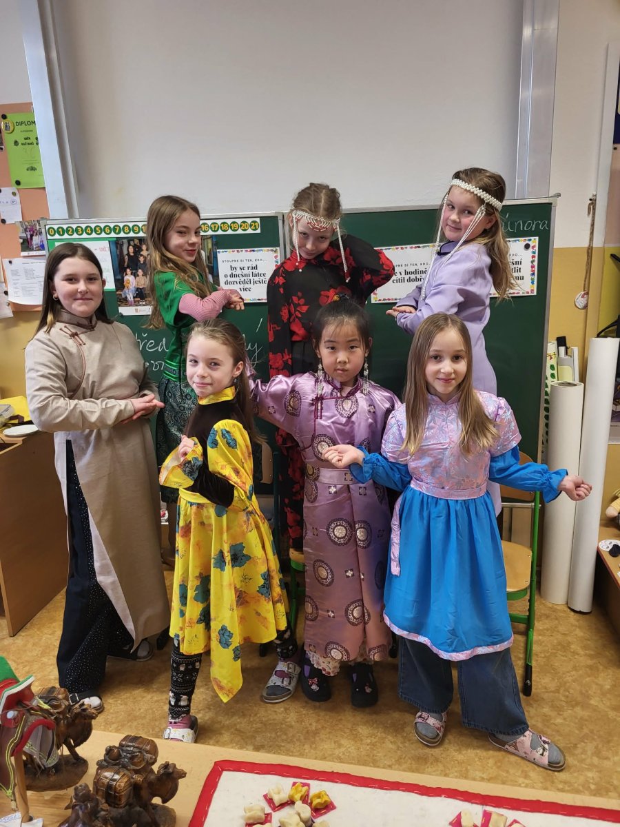 Naši mongolští spolužáci slaví jeden z hlavních svátků "Cagán sar"(Bílý měsíc) mongolský lunární Nový rok. Ve třídě 3.C jsme si dnes vyzkoušeli, díky paní asistentce Sáře, tradiční mongolské kroje, ochutnali jídlo a zahráli hry. Dozvěděli jsme se spoustu informací o tamním životě a kultuře. Byla to vskutku netradiční, velmi zajímavá a poučná hodina.