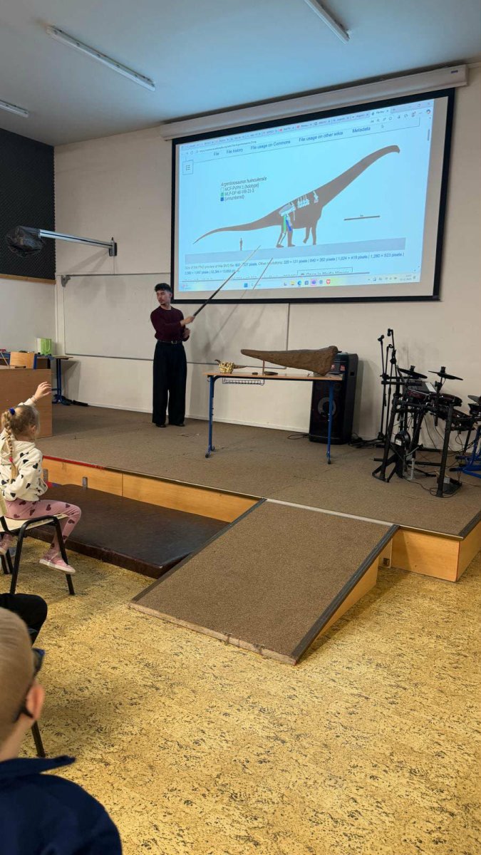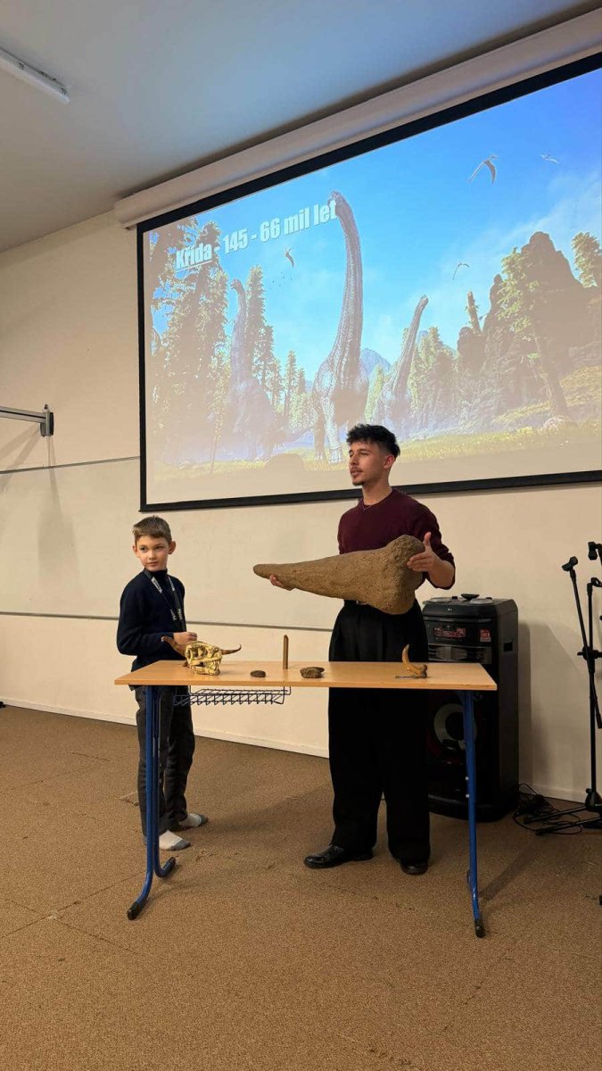 Dnešní návštěva, paleontologa Jakuba Matičky, proměnila naši třídu v okno do pravěku. Jeho poutavá přednáška o dinosaurech nás vtáhla do dob dávno minulých a nechala nahlédnout do fascinujícího světa, kde kdysi vládli obři dávných věků.