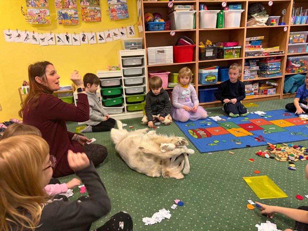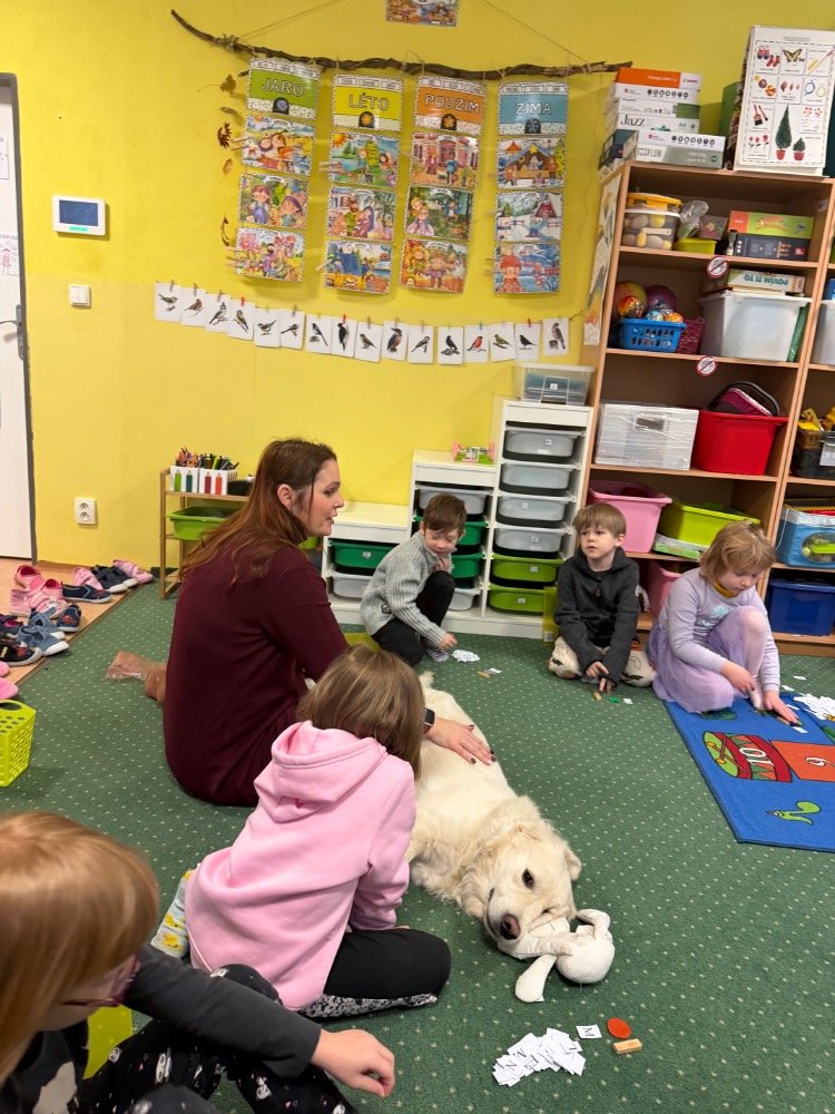 Je to fenka s průkazem původu, je plně očkovaná a pod pravidelným veterinárním dohledem. Naším cílem je postupně ji připravit na canisterapeutický výcvik, aby mohla děti podporovat ještě cíleněji – například při posilování sebedůvěry, soustředění nebo při adaptaci na školní prostředí.