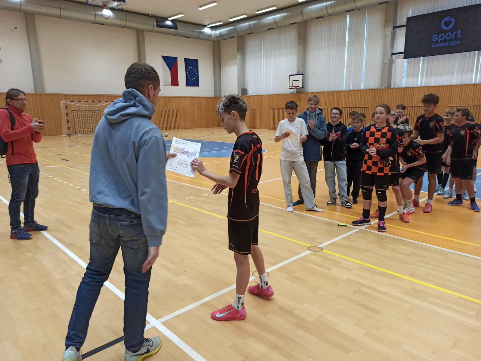 Ve středu 26.11. se v českolipské sportovní hale odehrálo okresní kolo v sálové kopané žáků 6.-7. tříd, kterého se zúčastnilo 10 škol. Ty byly rozděleny do dvou skupin po pěti týmech. Z každé skupiny postupovaly dva týmy do semifinále a poté do finále či do souboje o 3.místo. Naši žáci ve své skupině dvakrát vyhráli, jednou remizovali a jednou prohráli, což jim stačilo na 2.místo ve své skupině a tedy i k postupu do semifinále proti prvnímu týmu druhé skupiny, tím byl Cvikov. Kluci s nimi odehráli velice vyrovnané utkání, které skončilo 0:0 a o postupujícím musely rozhodnout penalty. V nich byli v poměru 2:1 úspěšnější naši žáci a postupují do FINÁLE! V něm pak vyzvali ZŠ Lada a po výborném výkonu vítězí nad nimi 2:0 a celý turnaj vyhrávají! Stávají se tak pro rok 2025 okresním mistrem!! Gratulujeme!!